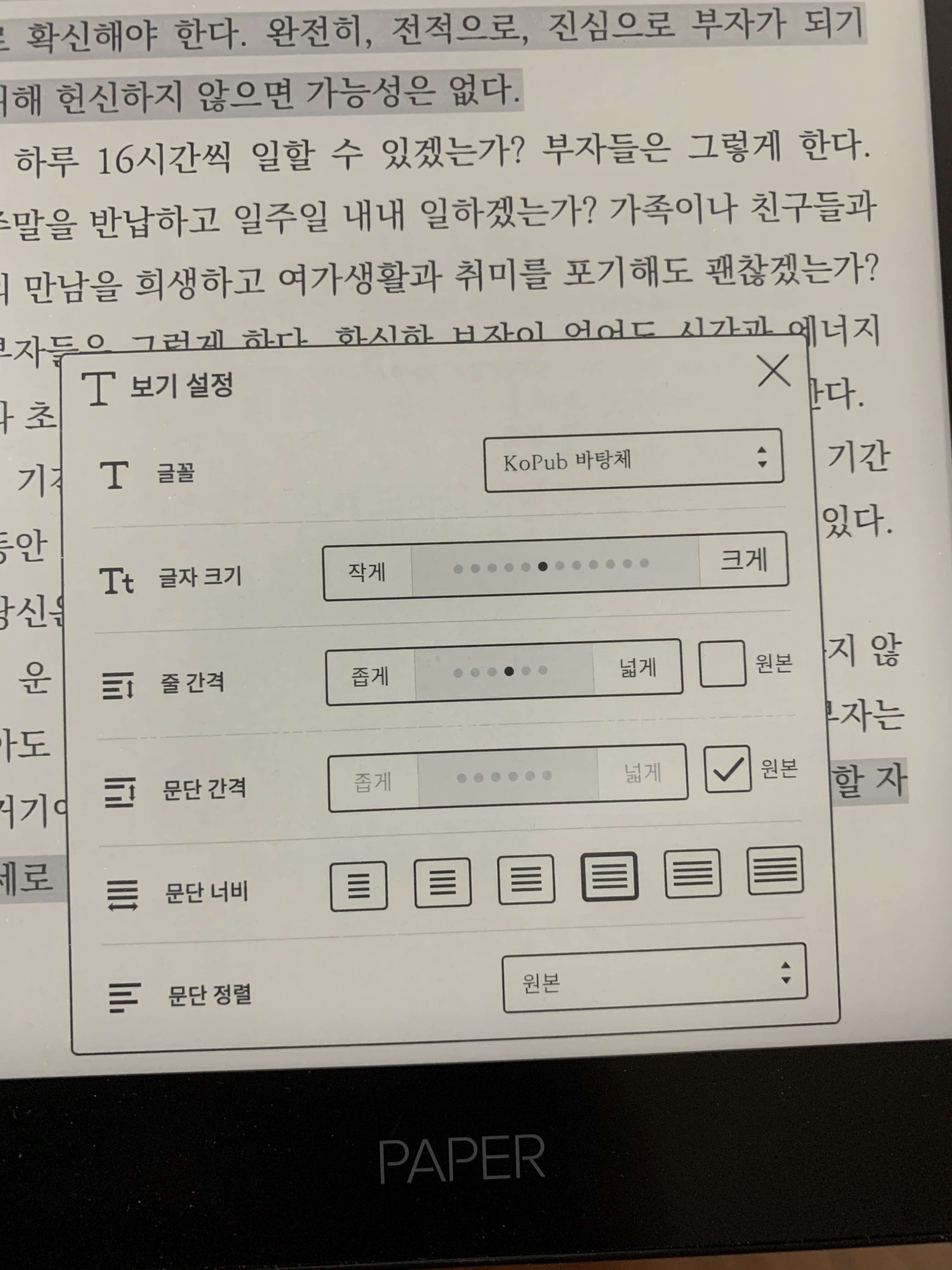 인쇄된 종이책과는 다르게 디지털 기반의 전자책만이 가지는 장점입니다. 원하는대로 내 취향대로 바꿔서 보는게 바로 그 맛이죠.