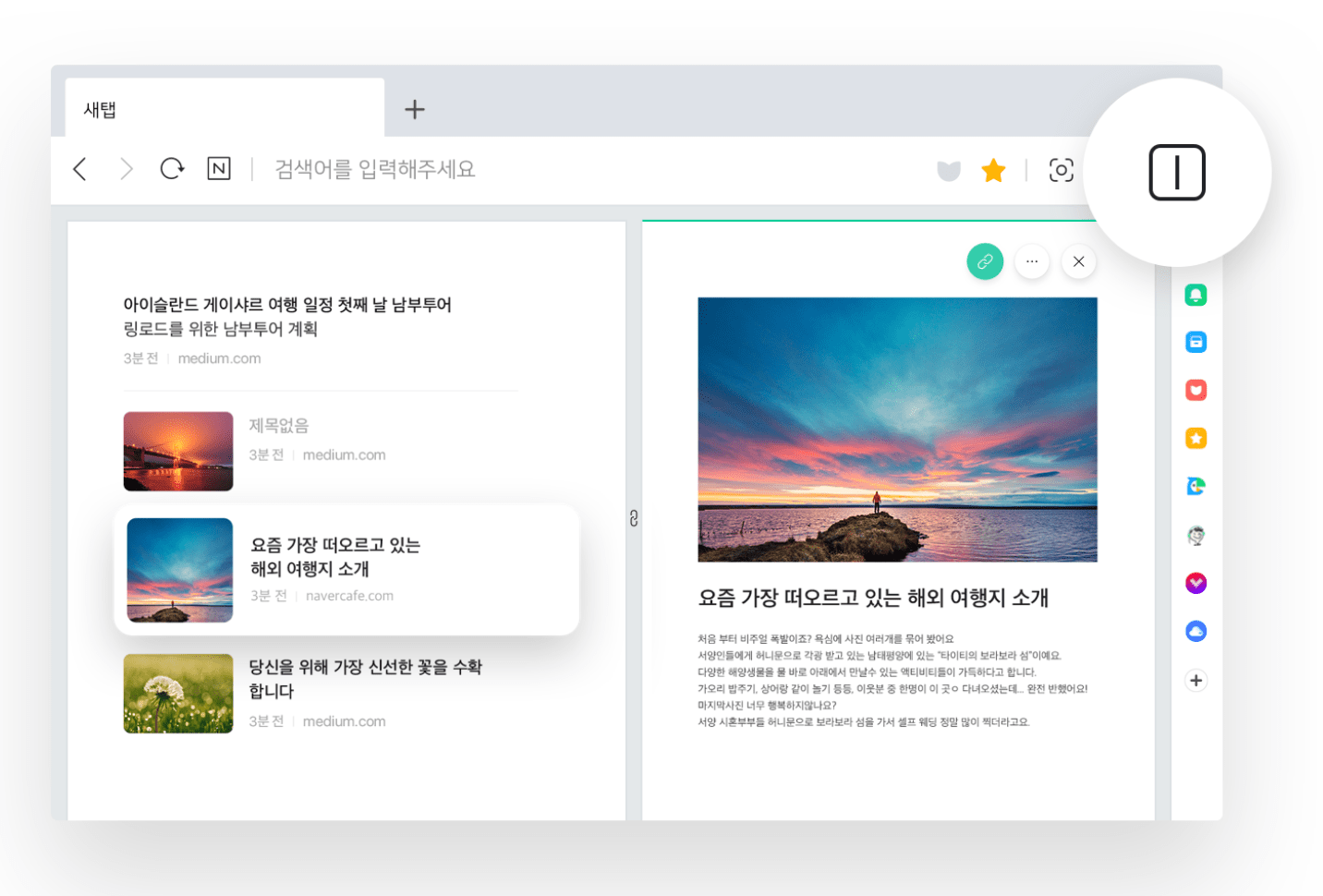 이럴때 필요한 기능이 바로 웨일의 스크랩북 기능입니다. 브라우저 옆에 있는 꽃모양 아이콘을 누르면 현재 읽던 페이지를 스크랩해 줍니다.