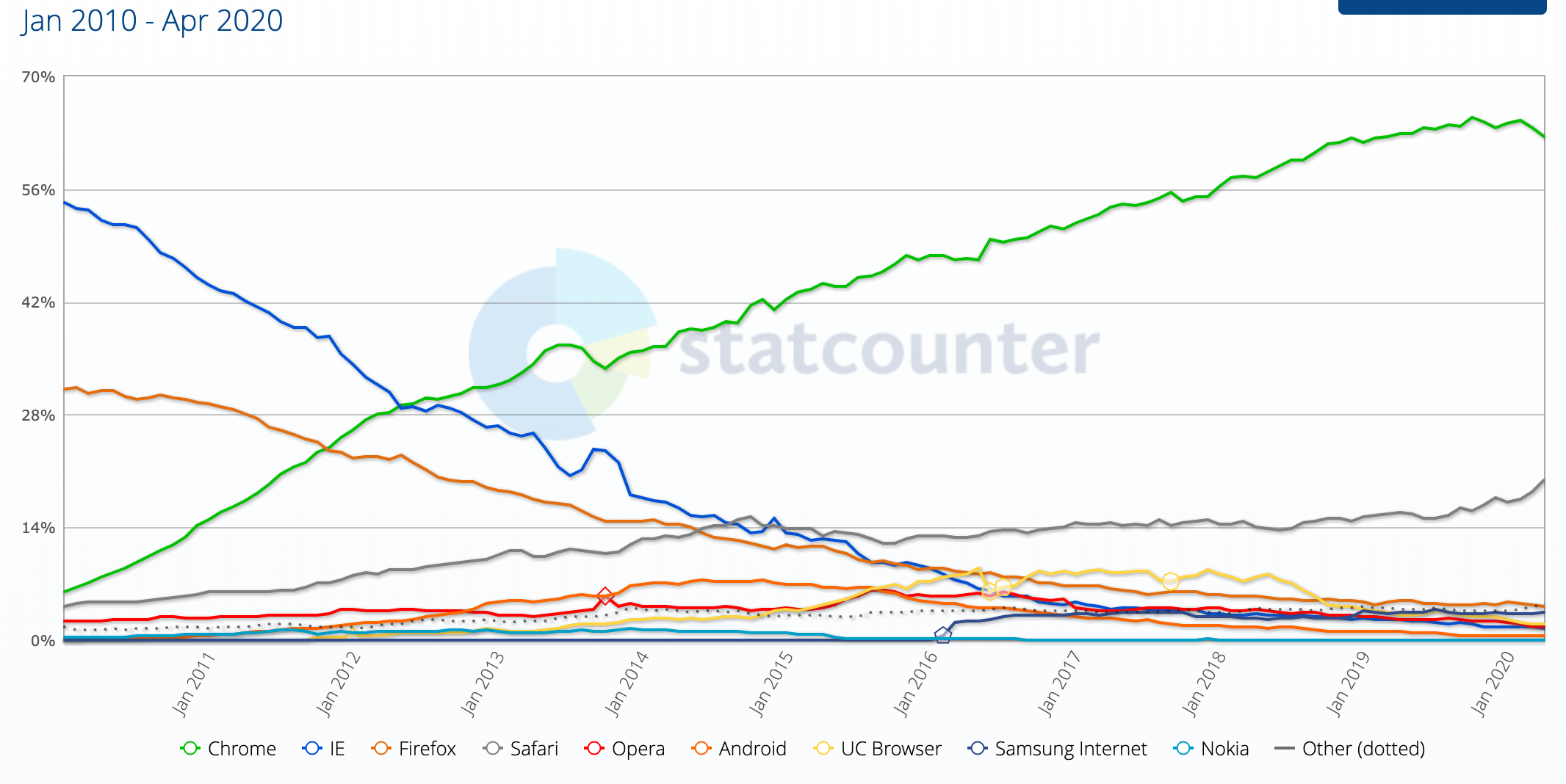 인터넷 익스플로러가 한때 전체 인터넷의 90%를 차지하던 시대가 있었습니다. 그러다가, 구글이 크롬 브라우저를 개발하기 시작했고, 크롬이 슬금슬금 대세 브라우저가 되었습니다.