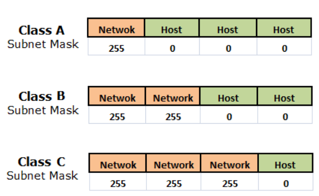 위에서 설명했던 서브넷 마스크를 기준으로 IP주소를 구분해 보면, A-B-C 클래스별로구분할 수가 있습니다. 흔히, 우리가 사용하는 IP는 C클래스 대역임을 알 수가 있습니다.