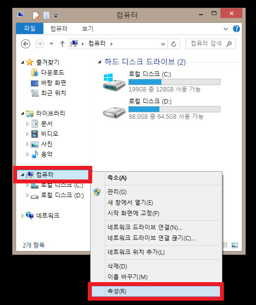 내컴퓨터에서 마우스 오픈쪽 버튼을 클릭하고, 속성으로 들어갑니다.