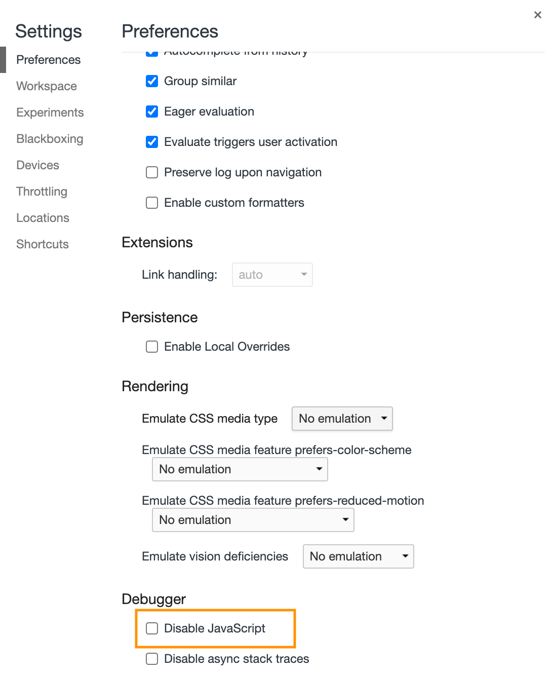 톱니바퀴를 클릭하면 아래 그림처럼 상세 설정하는 메뉴가 나옵니다. 아래쪽으로 쭉 내려보면 Disable javascript 가 있는데, 그 메뉴를 체크하면 즉시 마우스 우클릭이 해제됩니다.