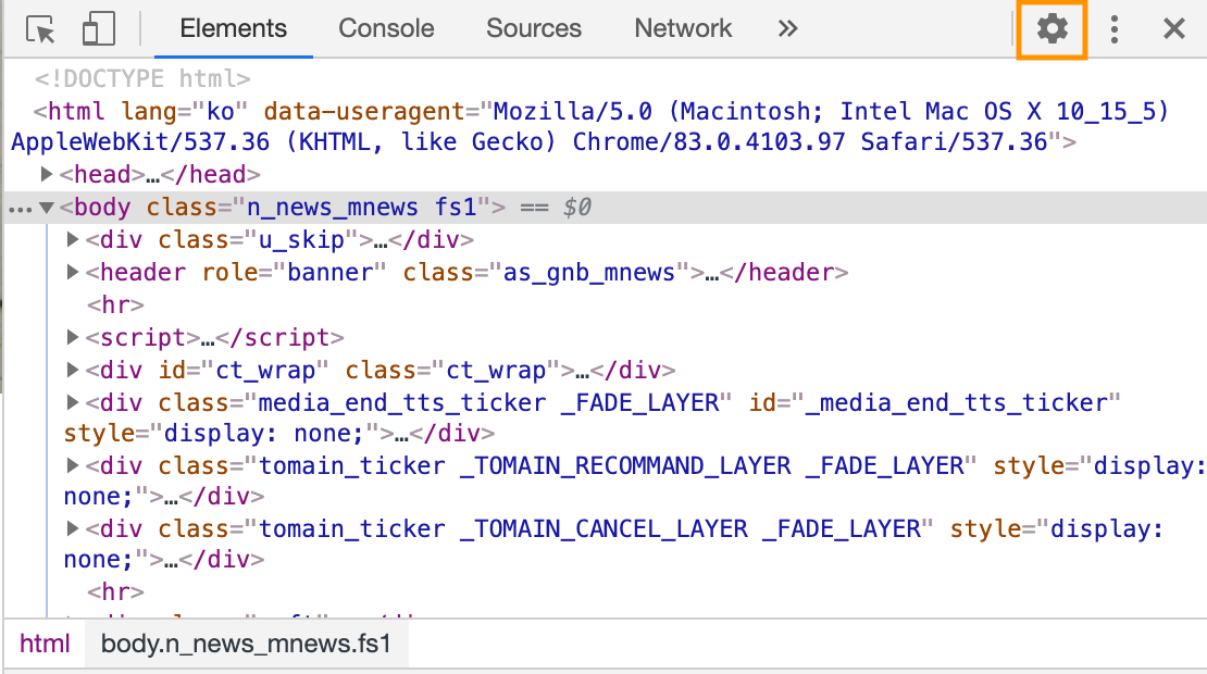 개발자 도구를 열면 아래와 같은 HTML 코드가 나오는 창이 나오는데요. 전부 무시하고 오른쪽 상단에 있는 톱니바퀴를 클릭하세요.