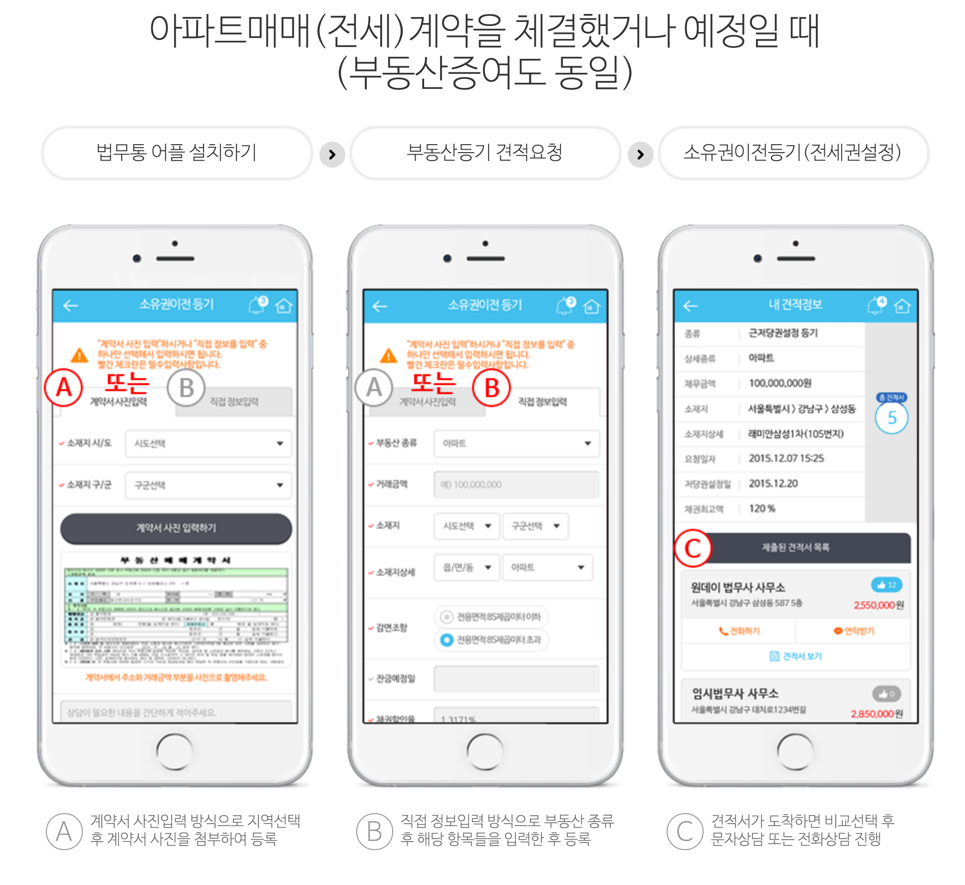 홈페이지나 앱에서 견적을 요청하면 여러 법무사들이 실시간으로 견적을 등록합니다. 그러면, 그 중에서 가장 저렴한 법무사를 선택하기만 하면 끝나는 겁니다. 실제 법무사 수수료도 부동산 중개소에서 추천하는 법무사 대비 절반 가까이 저렴하니 사용안할 수가 없겠지요.