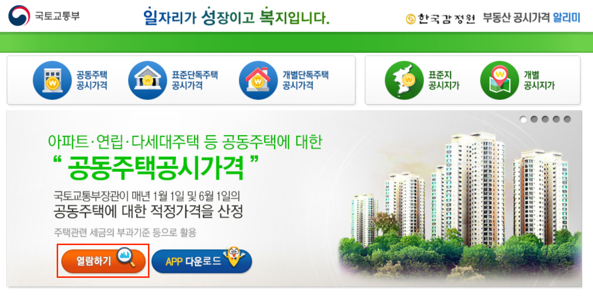 사이트 첫화면에 보이는 공동주택 공시가격 열람하기 버튼을 클릭합니다.