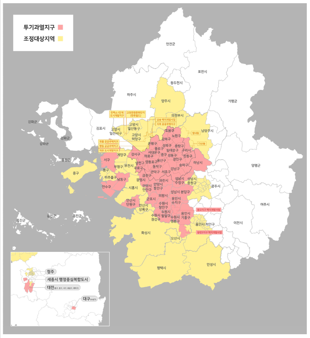 2020년 617 부동산 대책을 기준으로 수도권 대부분의 지역이 조정대상지역 이상으로 지정되었습니다. 그 현황은 아래와 같습니다.