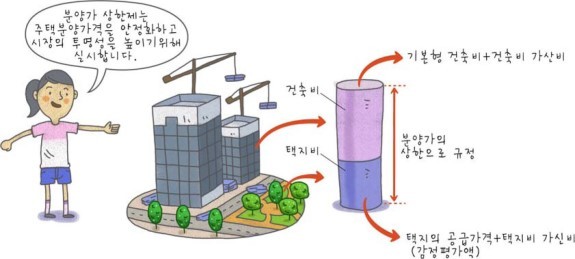 분양가 상한제는 새로 짓는 신규 아파트의 분양 가격을 제한하는 제도입니다. 집값을 안정화 시키기 위해서 택지비 (토지)와 건축비를 합해서 분양가를 산정한 뒤, 해당 지차에의 심사위원회의 승인을 받도록 하는 것입니다.