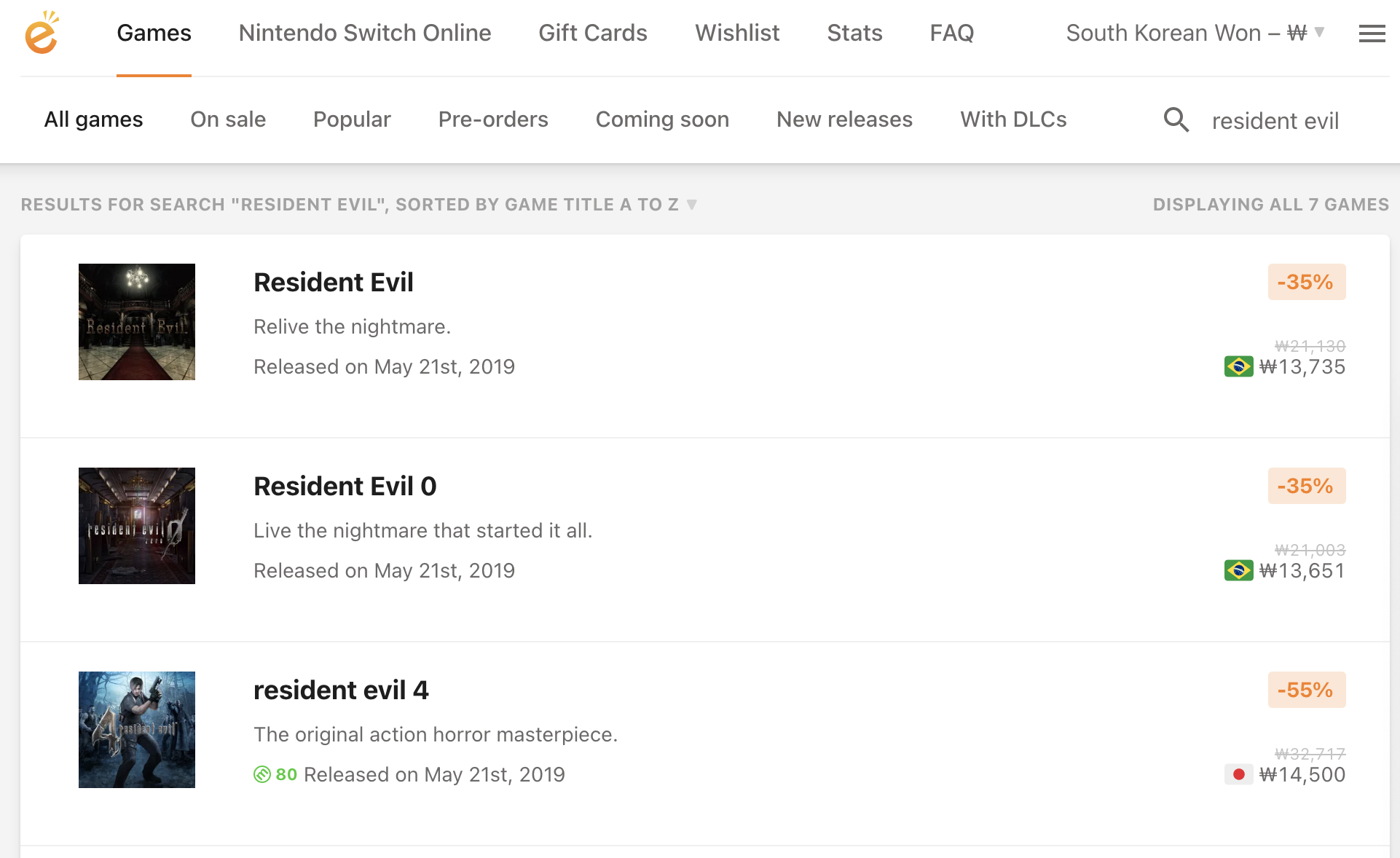 resident evil로 검색을 해봤습니다. 국가마다 할인률이 다르기 때문에, 어디가 저렴한지 살펴보기에 좋습니다.