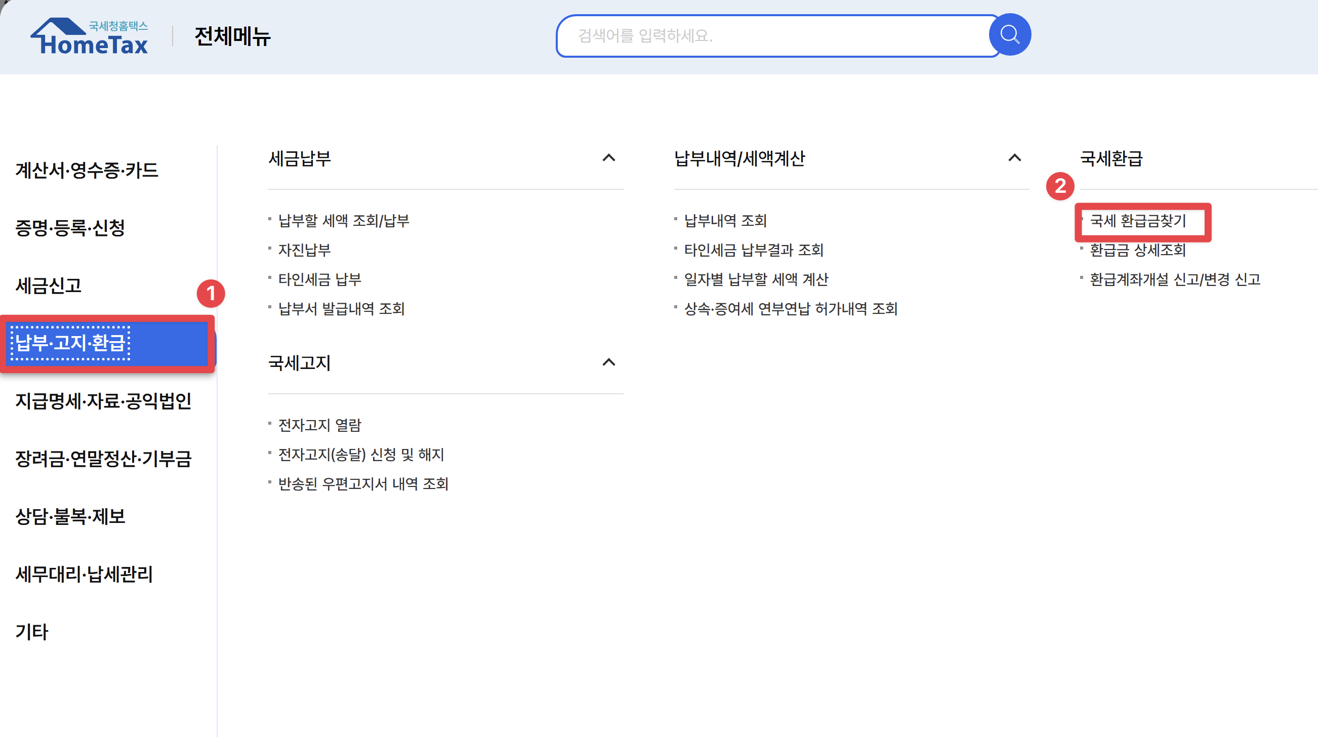 → [세금신고 납부] → [국세 환급금 찾기] 선택