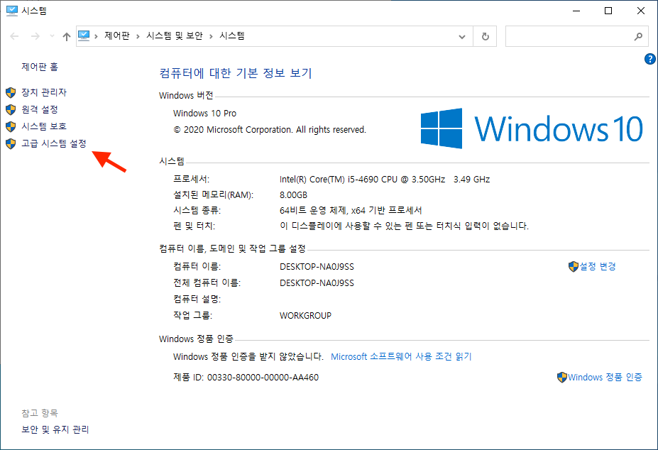‘내 PC’ 아이콘 → 마우스 오른쪽 버튼 클릭 → ‘속성’ → 좌측 ‘고급 시스템 설정’ → ‘성능 설정’ 메뉴로 이동하세요